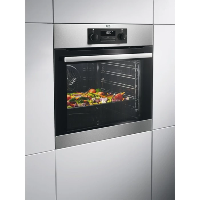Der AEG BPB331020M SurroundCook Multifunktionsbackofen ist mit einem Nutzinhalt von 71 Litern optimal für jede Küche geeignet und lässt sich als Einbaugerät nahezu überall platzieren. Das Heißluftsystem mit Ringheizkörper sorgt für eine gleichmäßige Zirkulation der Heißluft im gesamten Garraum. Der Backofen heizt sich schneller auf, wodurch sowohl Zeit als auch Energie gespart wird. Zudem sorgt die Heißluft mit Ringheizkörper für gleichmäßiges Garen. Dank der „SafeToTouch Top“-Außentür bleibt die Außenseite der Ofentür auf einer niedrigen Temperatur. Mit Aktivierung der Pyrolyse-Selbstreinigungsfunktion werden Schmutz, Fett und Essensreste im Ofen in Asche verwandelt, die im Anschluss ganz leicht mit einem feuchten Tuch abgewischt werden kann. In puncto Sicherheit glänzt der BPB331020M mit einem Kühlgebläse.