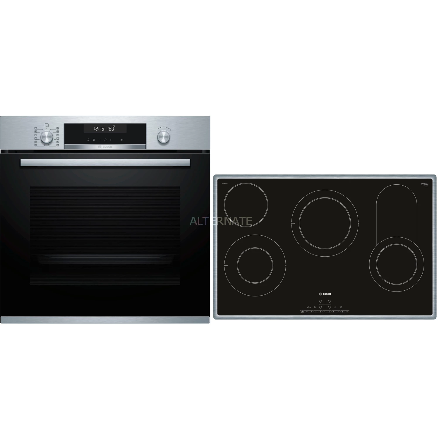 Das Backofen-Set Bosch HBD672LS81 überzeugt mit einem Backraumvolumen von 71 Litern und 10 Heizarten sowie einer zuschaltbaren Schnellaufheizfunktion. Die Bedienung mit weißem LCD-Display gestaltet sich dank direktem Zugriff auf Zusatzfunktionen besonders einfach. Die 3D-Heißluft sorgt für perfekte Backergebnisse auf bis zu drei Ebenen gleichzeitig dank optimaler Wärmeverteilung. Die AutoPilot 30 Automatikprogramme bereiten die Speisen automatisch perfekt zu. Dank automatischer Pyrolyse-Selbstreinigungsfunktion ist der Putzaufwand minimal. Das autarke Kochfeld Bosch PKC845FP1D mit umlaufendem Edelstahlrahmen bietet vier HighSpeed-Kochzonen, davon eine Bräterzone und zwei Zweikreis-Kochzonen. Die 17 Leistungsstufen lassen sich bequem über DirectSelect einstellen und die Glaskeramik-Oberfläche ist leicht zu reinigen. Der Timer mit Abschaltfunktion schaltet die gewählte Kochzone nach der gewünschten Zeit ab und PowerBoost ermöglicht bis zu 20 Prozent schnelleres Ankochen.