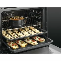 Der AEG EPB43502BM SurroundCook Multifunktionsherd bietet einen MaxiKlasse Garraum von 71 Litern und acht Beheizungsarten. Das Heißluftsystem mit Ringheizkörper sorgt für eine gleichmäßige Zirkulation der Heißluft im gesamten Garraum, sodass Gerichte gleichmäßig auf bis zu drei Blechen gegart werden. Mit der 2-stufige Pyrolyse-Selbstreinigungsfunktion werden bei ca. 480 °C Schmutz, Fett und Essensreste zu Asche verbrannt. Nach Abschluss der Reinigung lassen sich die Rückstände mit einem feuchten Tuch von den Glatten Innenwänden einfach abwischen. In Puncto Sicherheit überzeugt der EPB43502BM mit einer Kindersicherung, einem Kühlgebläse und einer Restwärmeanzeige.