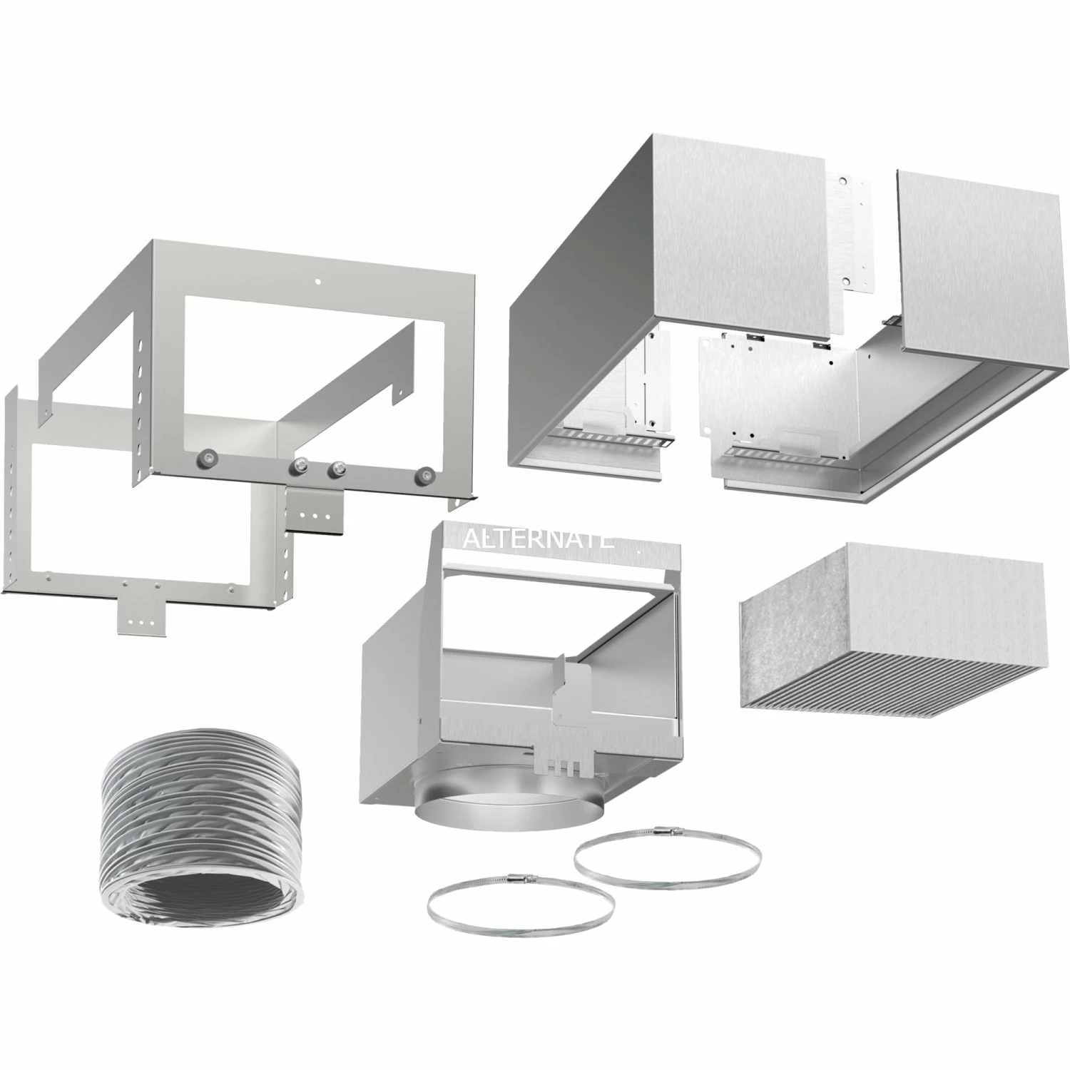 | Inhalt | Filtergehäuse, mit, Designblende, CleanAirPlus, Aktivkohlefilter, Flexschlauch, 2, Schlauchschellen, und, Befestigungsmaterial |