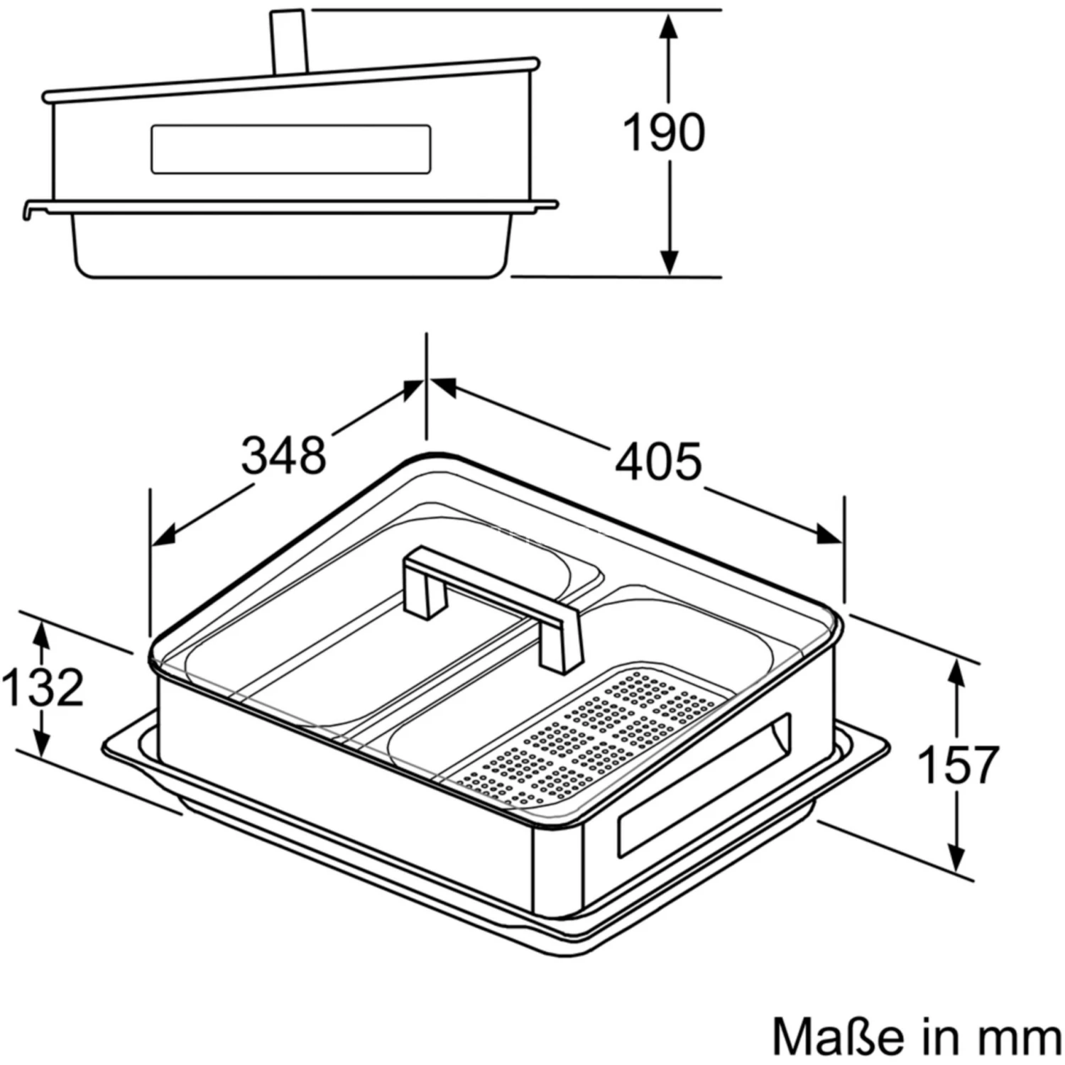Das Dampfset Z19DD10X0 von Neff ermöglicht druckloses Dampfgaren bei ca. 100° für volles Geschmacksaroma und Vitaminerhalt. Der große Innenraum ist zum Garen von Speisen für bis zu 8 Portionen ausreichend, auch gleichzeitiges Arbeiten ist auf max. 2 Ebenen möglich. Das Set enthält eine Auflaufpfanne, einen gelochten Dampfbehälter Größe L, einen gelochten und einen ungelochten Dampfbehälter Größe S aus Edelstahl und einen Glasdeckel aus Sicherheitsglas.